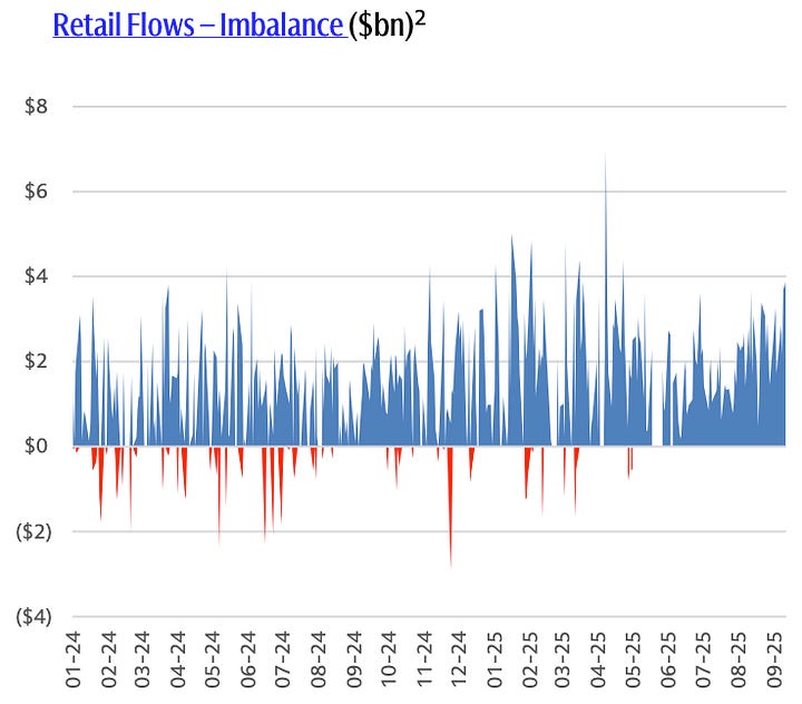 In Q3 to date, odd lots, defined as orders of less than 100 shares, comprise ~66% of US equity trades; this is up from only 31% in January 2019.