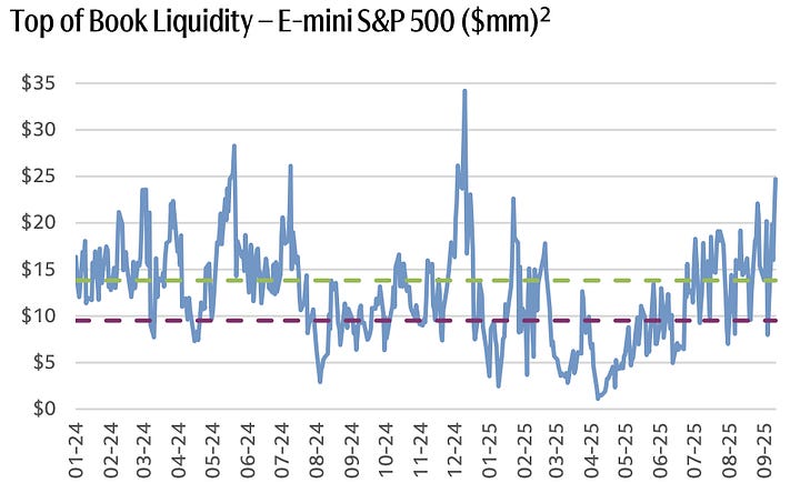 Last week, retail flows had a net buy imbalance of $16bn. E-mini S&P 500 top-of-book liquidity was up +19% vs. the 10-day average. Overall market volumes were up +8% WoW.