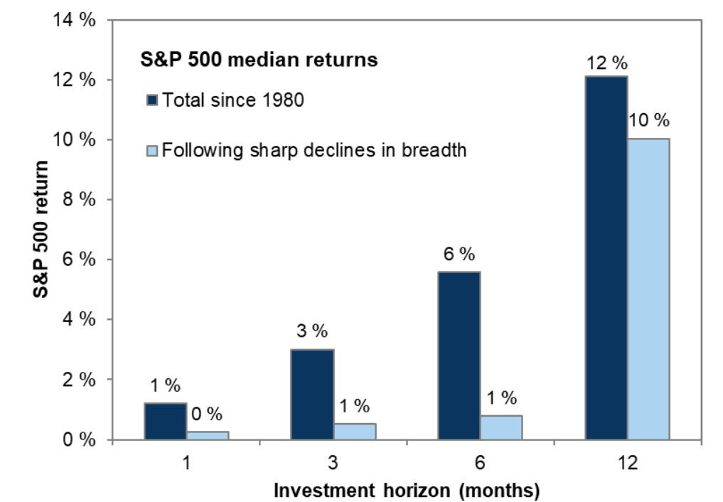 While narrow breadth has been cited as a cause for concern, we find that the median returns looking back to 1980 for the S&P following sharp declines in breadth is flat over 1m but up + 1% by 3m and + 10% over 12m.