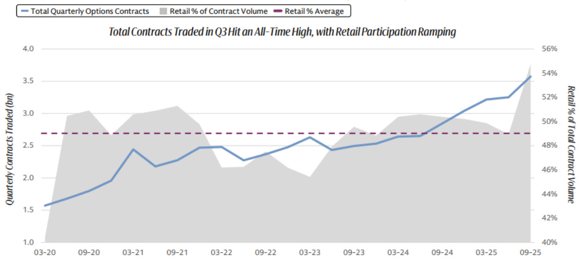 Contract volumes have set new records, with retail participation being a key driver. For the first time on record, the U.S.-listed options market traded over 3.5 billion contracts in a single quarter. Q3 2025 contract volumes were up +10% QoQ and +26% YoY.