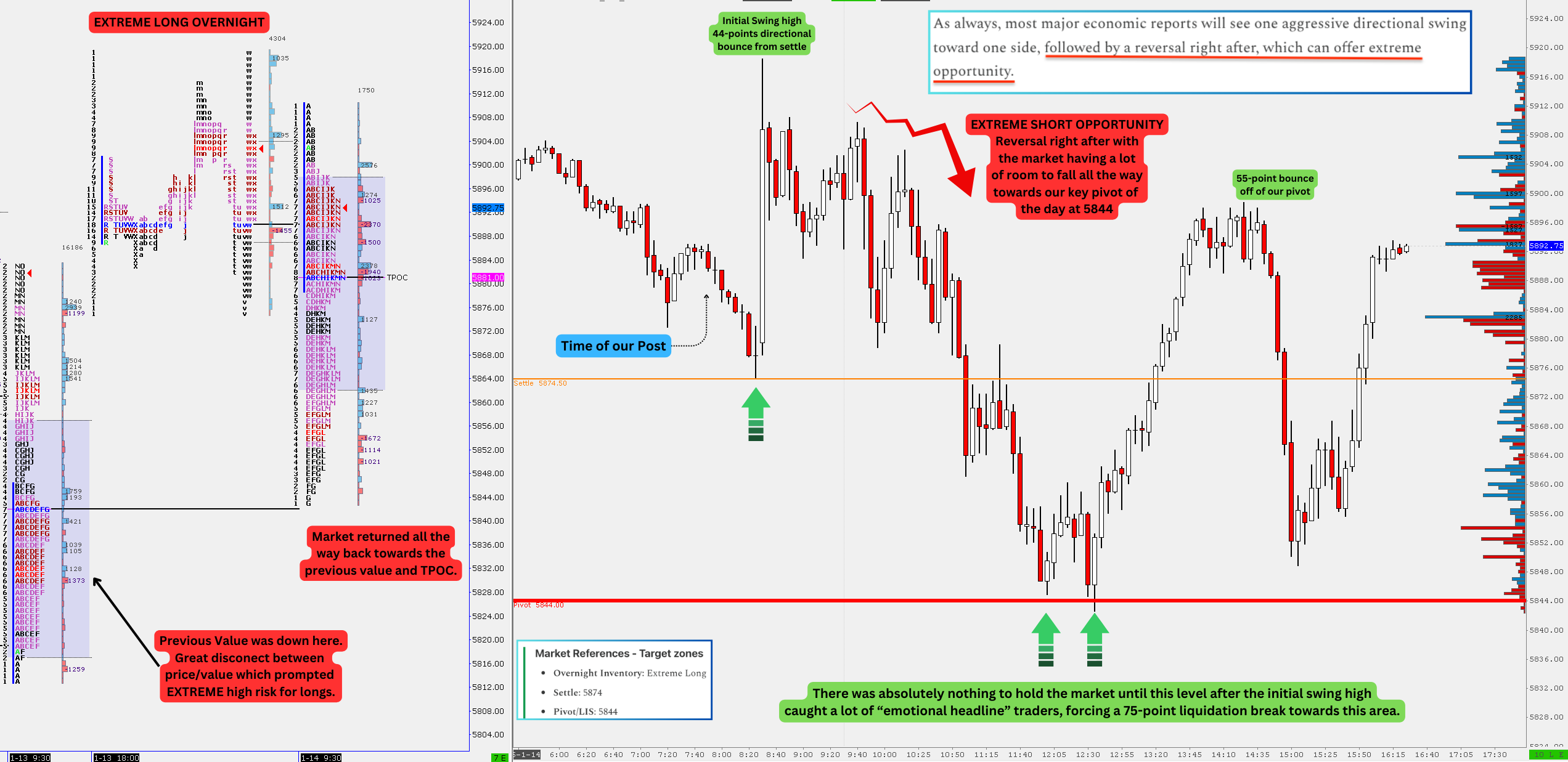 As we always say, entering a trade doesn’t take time; preparing and waiting for it should. The initial “extreme opportunity” was a 75-point short, with the market having plenty of room to fall toward the pivot, followed by a 50-point bounce long.