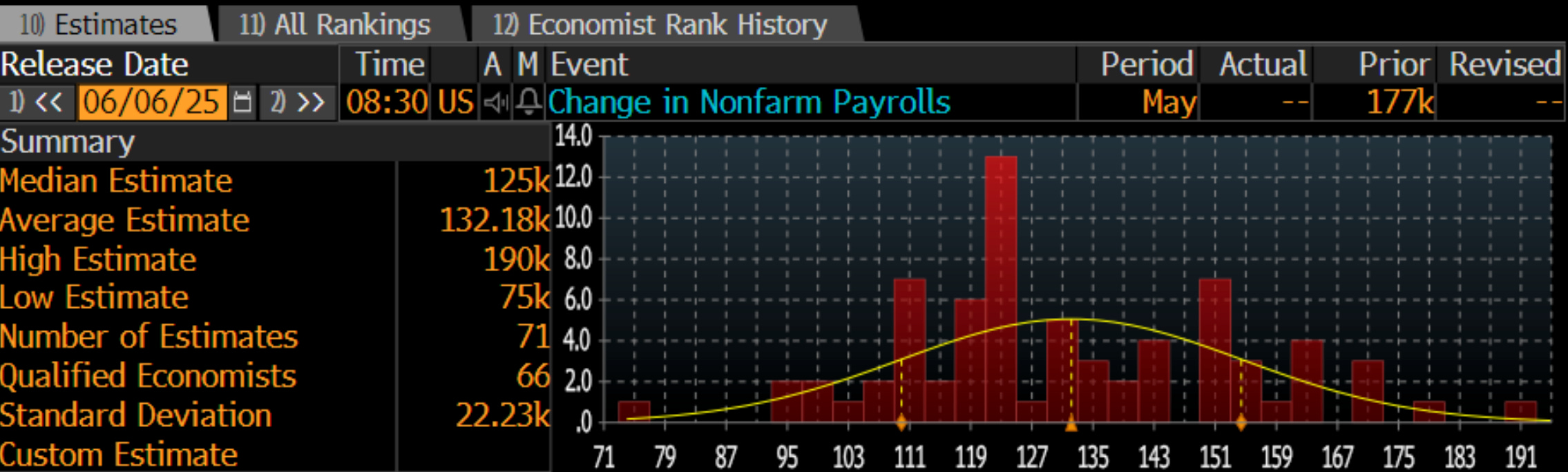 Following the scenarios posted yesterday regarding NFP, we see Wall Street estimates nonfarm payrolls would rise 125k in May. We see estimates that the unemployment rate was unchanged at 4.2% on a rounded basis.