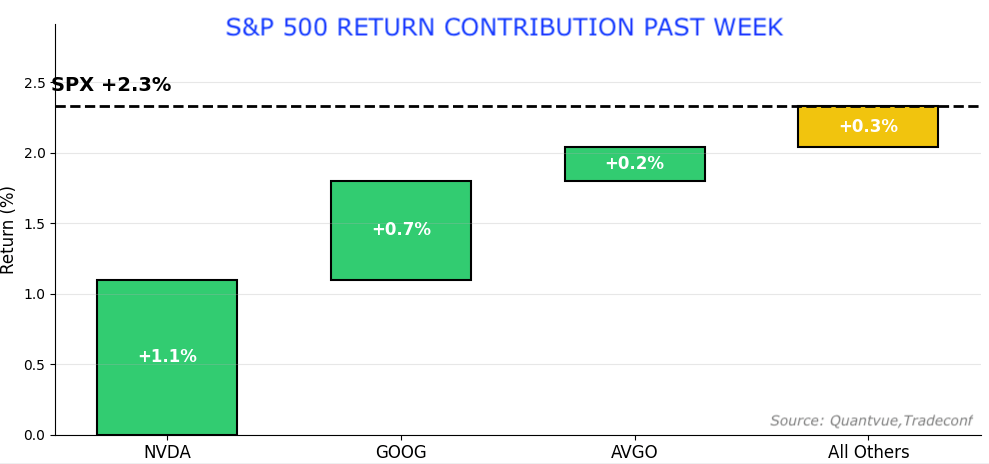 To further contextualize our observation, the chart below shows that the past 5-day rally in the SPX (through Wednesday’s close) was almost entirely driven by the returns of three stocks.