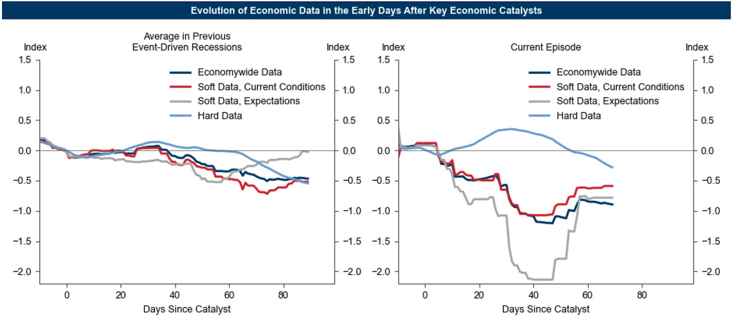 It often takes longer for the hard data to deteriorate, and front loading of imports and spending has made them harder to interpret. The image below shows that the soft, or survey, data remain noticeably weaker than before tariffs were announced, despite rebounding a bit.