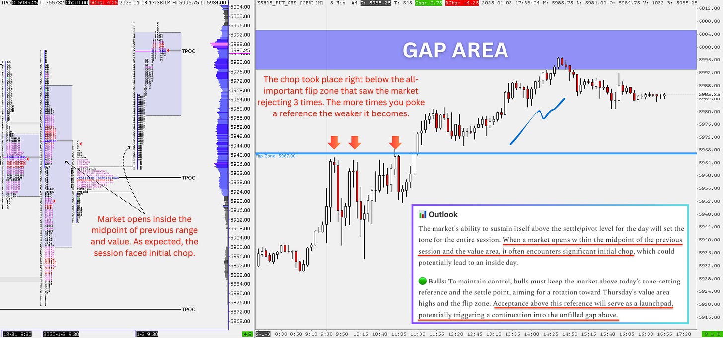 As anticipated during Friday’s session, after opening inside the midpoint and value area of the prior session, the market faced significant initial chop. This is yet another market nuance we shared in our previous Market Brief, which played out as expected.
