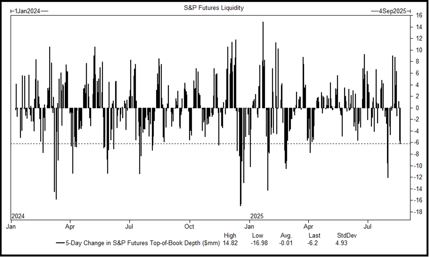 Starting to really feel like the end of August. S&P E-mini top-of-book depth was sub-$10m on the touch yesterday. The 5-day decline in liquidity of -$6.2m is one of the larger drops we have seen in the last few years.