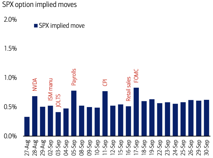 According to the S&P options market, the key catalysts to watch over the next month are, payrolls, CPI, and most of all the September FOMC meeting.