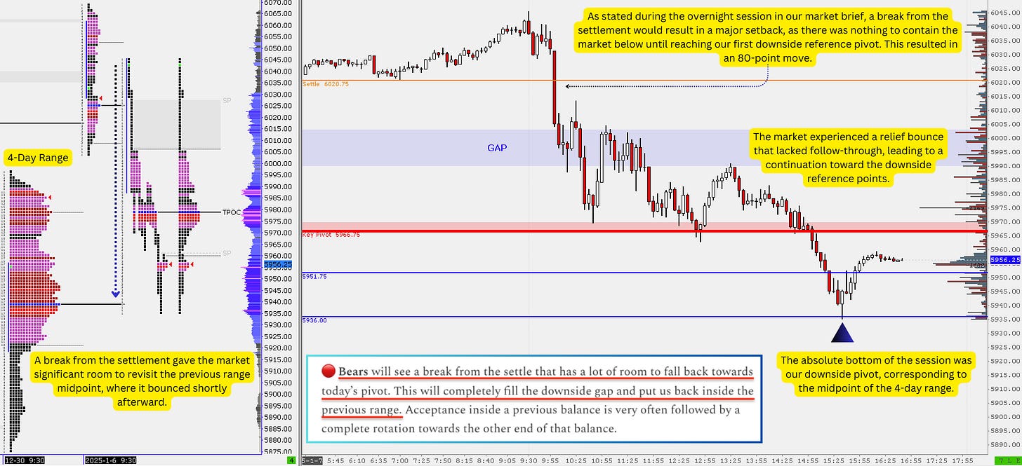 After a second attempt to sustain activity above this key area, the market broke down, targeting continuation. The absolute bottom of the session landed at the 5936 level, which coincided with the prior range midpoint. Following this, the market saw another 40-point bounce shortly afterward.