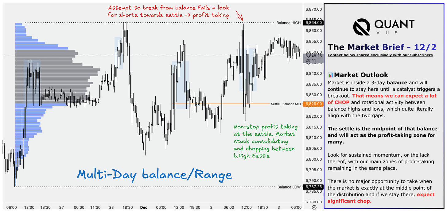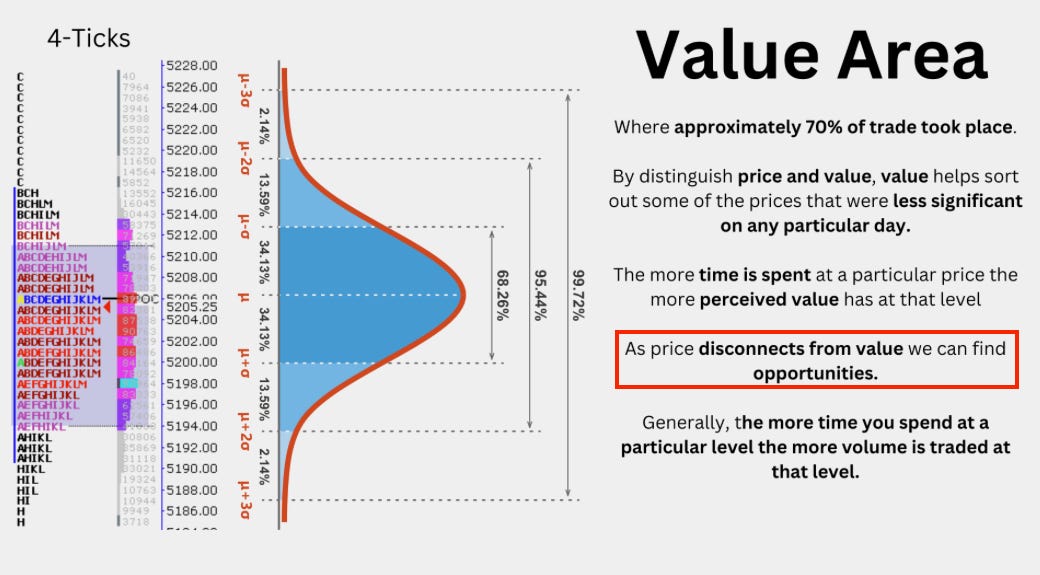 A key part of our approach is applying a probabilistic framework to market analysis. The shape on the image above might look familiar. When there are no catalysts strong enough to push the market away from equilibrium, prices tend to rotate between the edges and midpoint of that distribution curve, creating range-bound conditions.