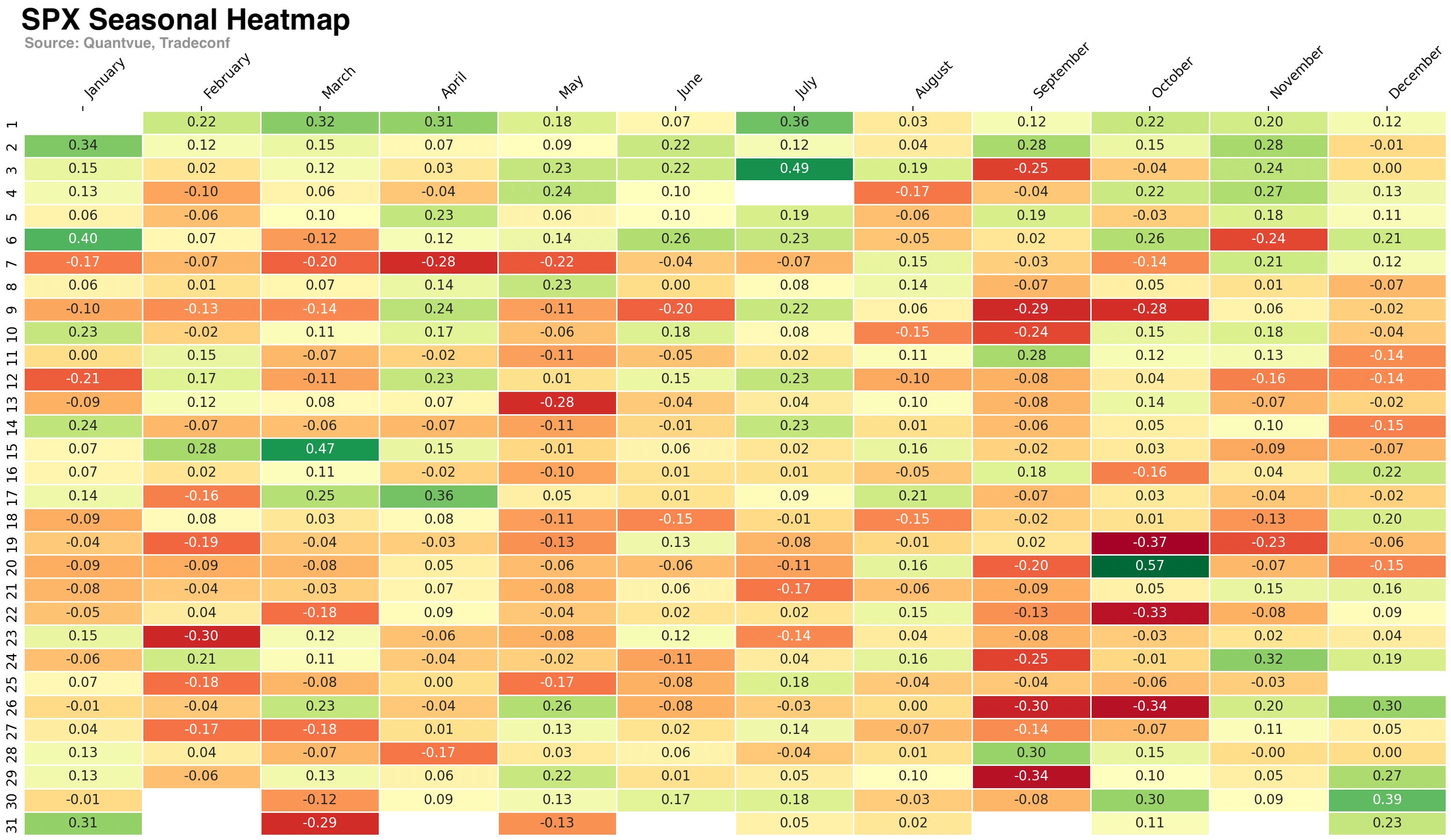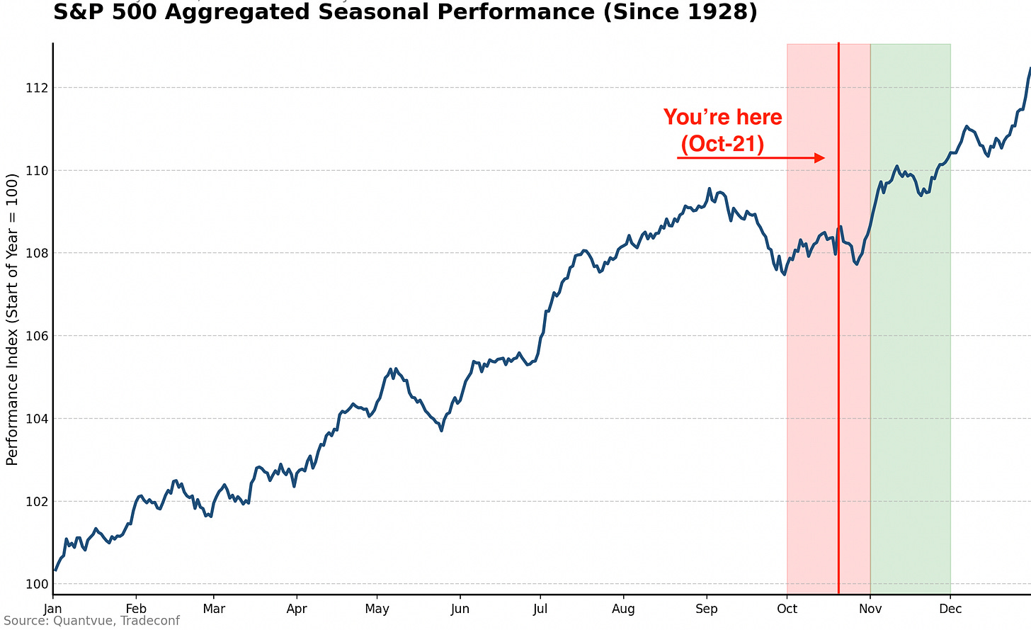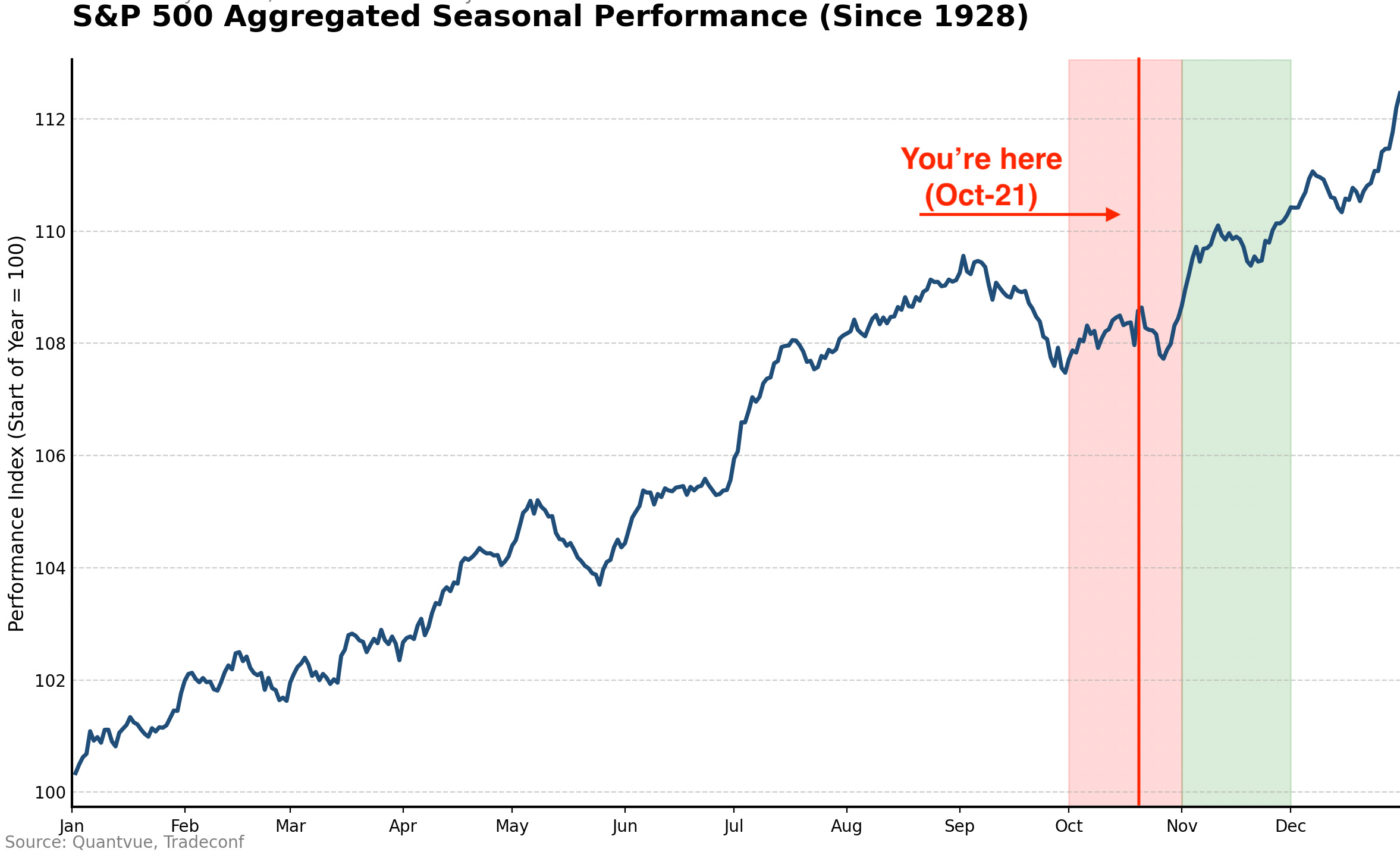 Looking back from 1928, October 20th (y-day) was the seasonally best trading day of the year with an average return of +57bps. The remainder of October has historically seen choppy price action prior to year-end holiday euphoria.