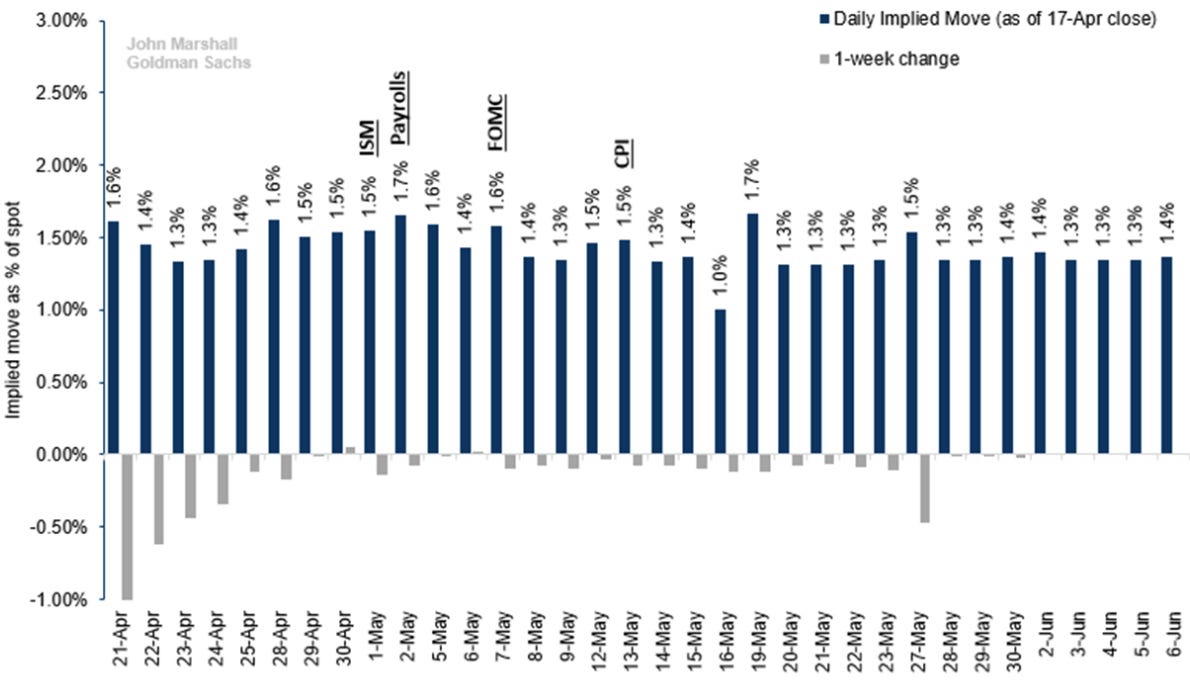 Near-term options prices have declined significantly as investors recognize that tariff negotiations will take time. Investors are pricing similar volatility across the next 6+ weeks.
