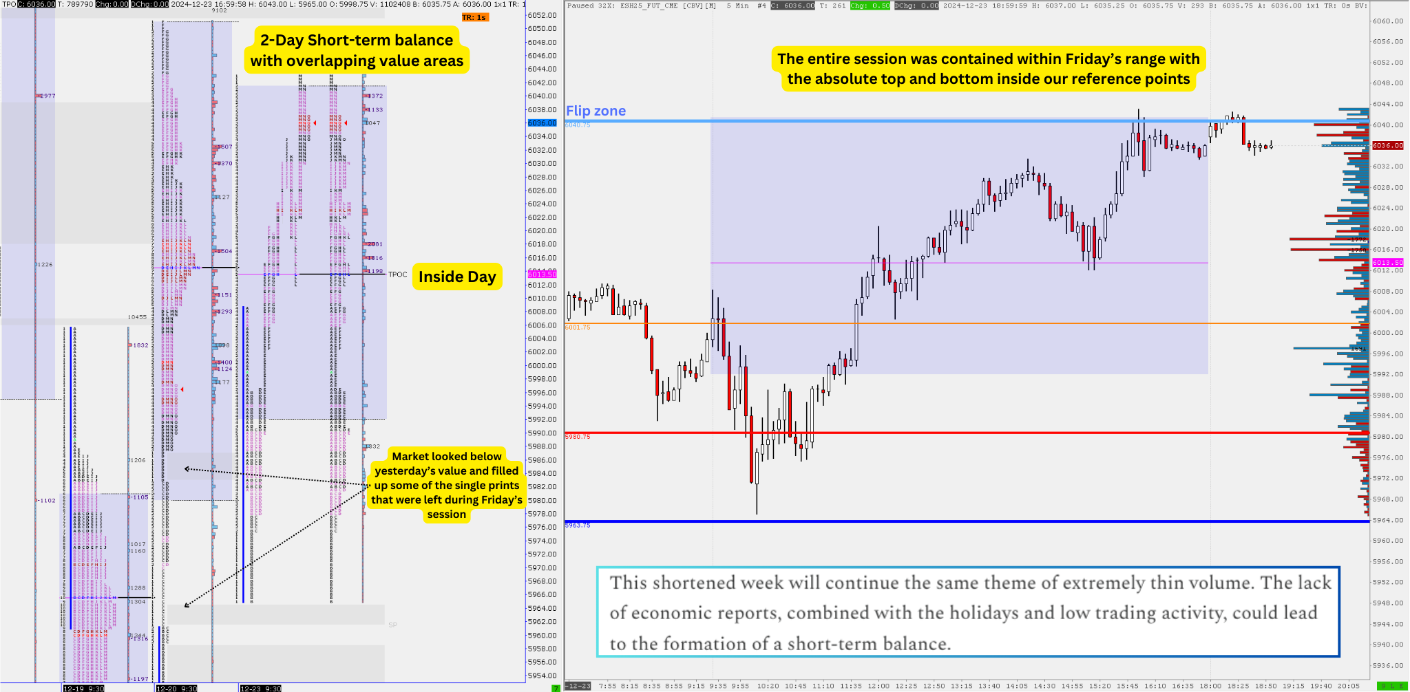 The market saw a bounce shortly after, reclaiming the upside references, with the absolute session top reaching the first upside level of 6040, where the market completely stalled to end the session.