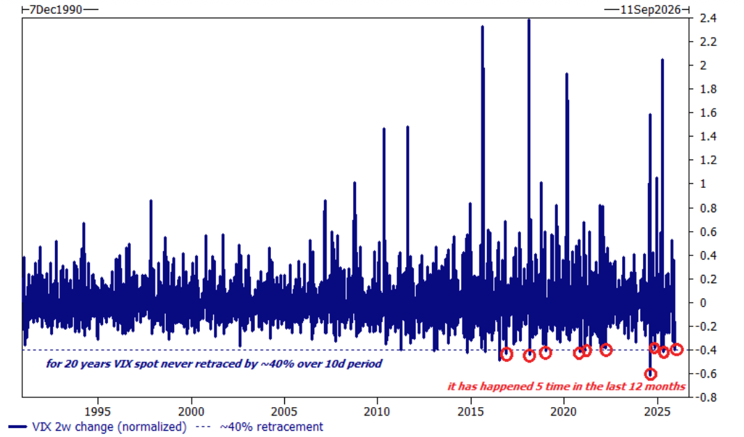 It’s remarkable how quickly fear gets priced in and then washed out in today’s market. Before 2011, the VIX had never retraced roughly 40% from spot within a two-week window. What was once unheard of has now become routine, with this kind of sharp pullback happening five times in just the past twelve months.