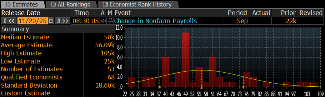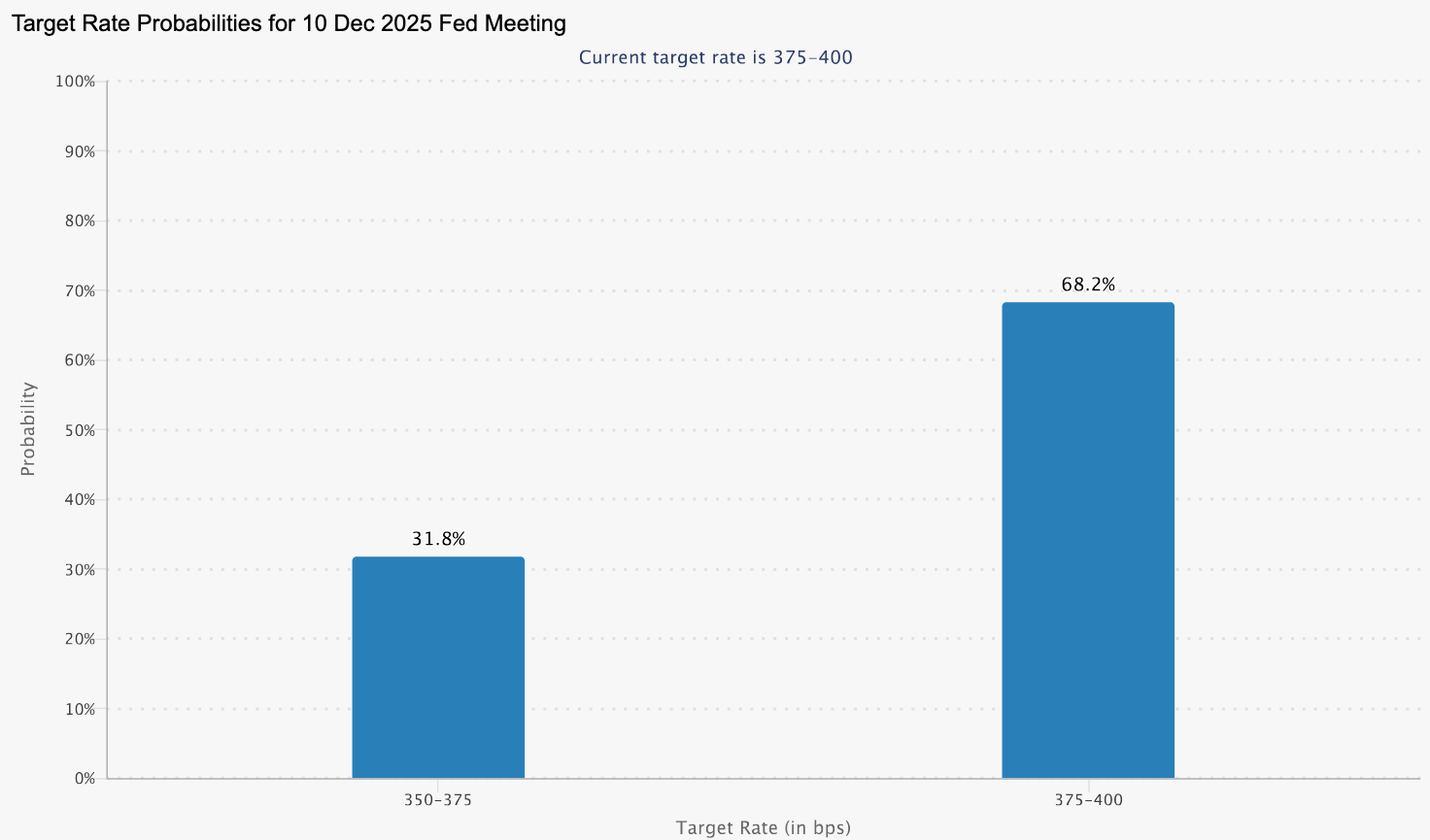 In addition, the BLS announced it will not publish a standalone October jobs report. Following these updates, the market’s implied odds of a rate cut fell from 45% yesterday to about 31% today.