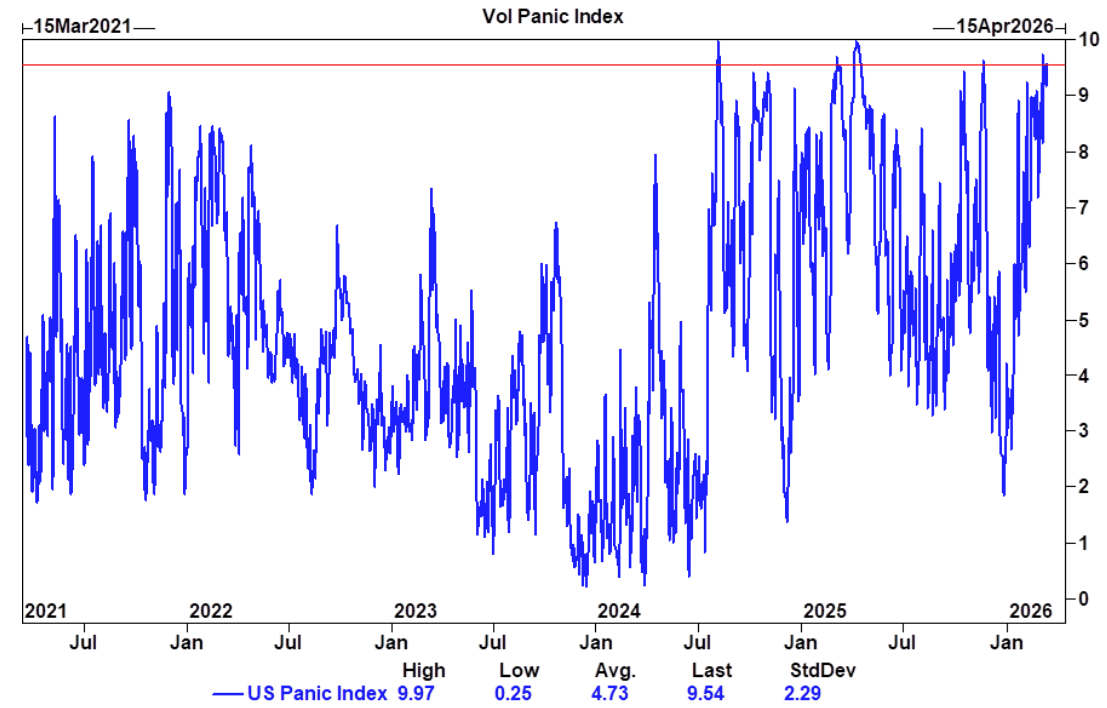 The Vol Panic Index closed at 9.54 out of 10, a highly elevated reading that suggests considerably more internal market stress than the headline index drawdown alone implies.