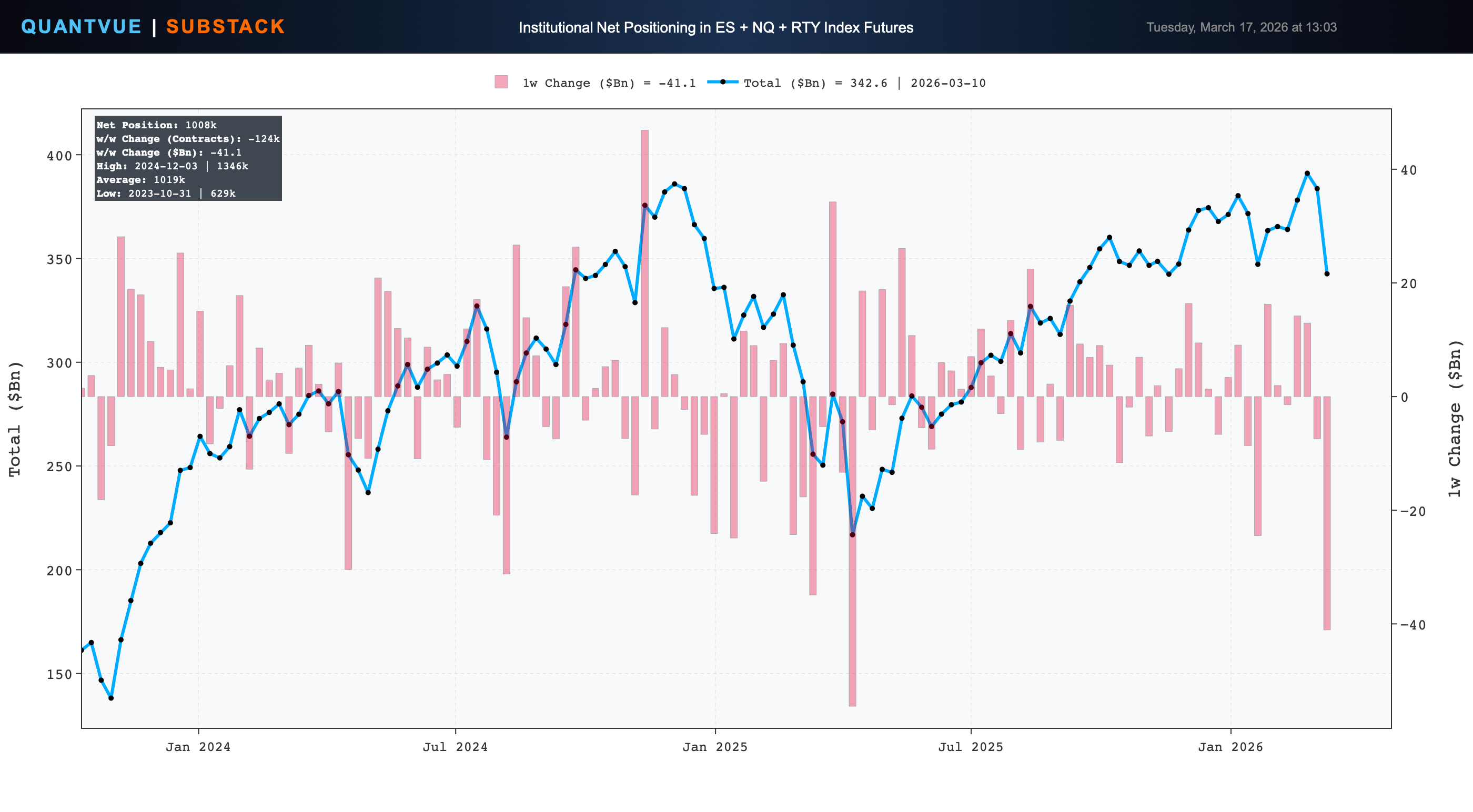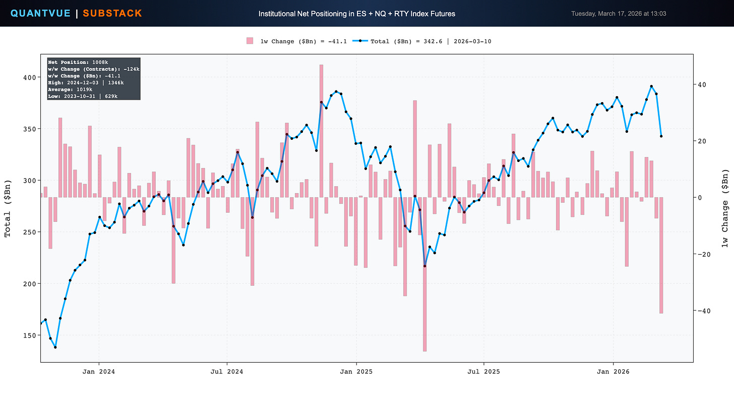 Positioning in US equity futures has also started to reset. Investors remain net long overall, but the speed of the recent reduction highlights that a meaningful amount of discretionary de-risking has already taken place.