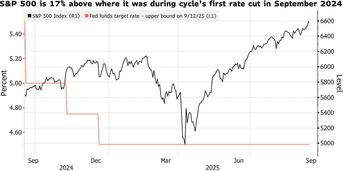 This Wednesday, the Fed is set to lower rates for the first time in 2025, pointing to a sluggish labor market as the driver. Remarkably, it will mark only the third time since 1996 that rate cuts have arrived while the S&P 500 sits at record highs.