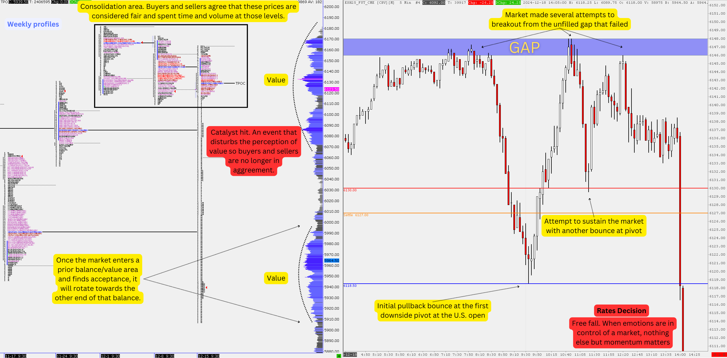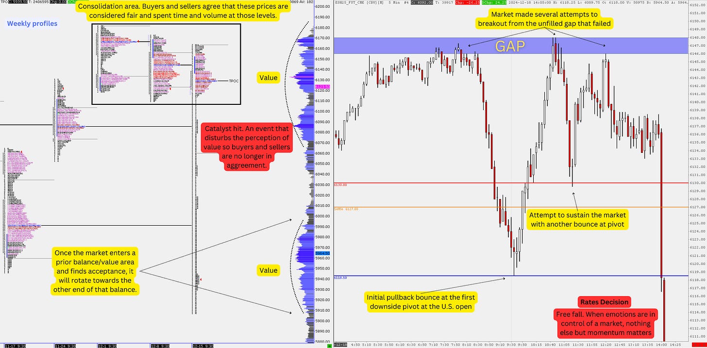 After initially rejecting that gap zone, the market bounced off the first downside pivot at 6118 and rotated back toward the same area, repeatedly attempting to fill the gap while moving back and forth around our pivot levels.