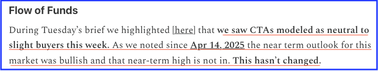 CTA estimates showed we had largely bottomed out, and skew existed to the upside—with sustained rallies expected to extend demand.