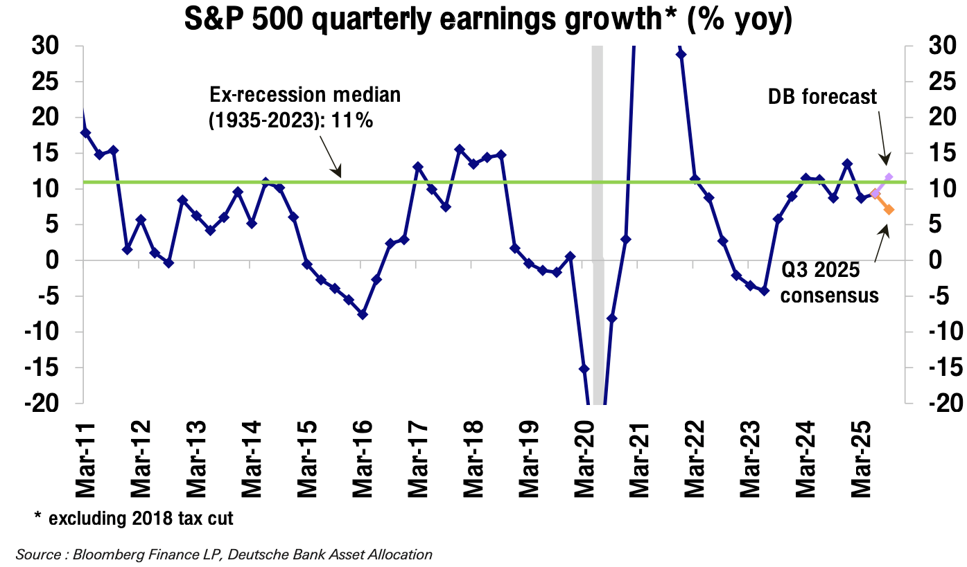 Markets are now eyeing the upcoming earnings. S&P 500 earnings growth has been hovering in a robust range around 11% for nearly 2 years. The macro backdrop has become favorable, with recent data pointing to solid growth in Q3.