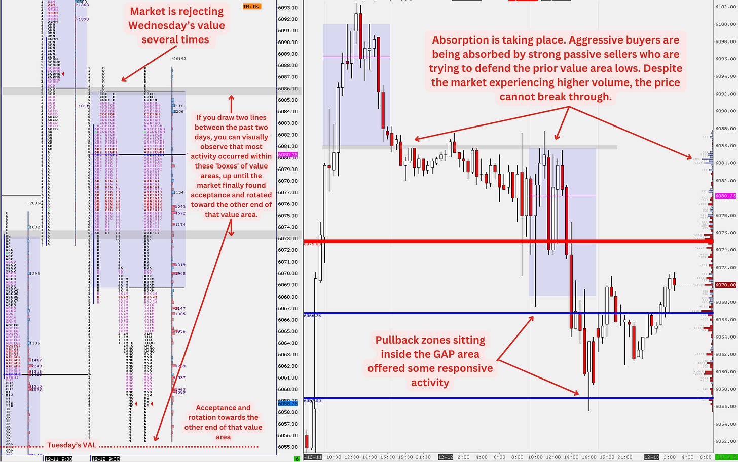 Despite the market's increased volume at these highs, the buying aggression was absorbed right at the value area lows of the prior session. This continued attempt to break out ultimately failed, as the market failed to sustain the tone-setting reference, which led to a liquidation break that saw continuation inside the gap.