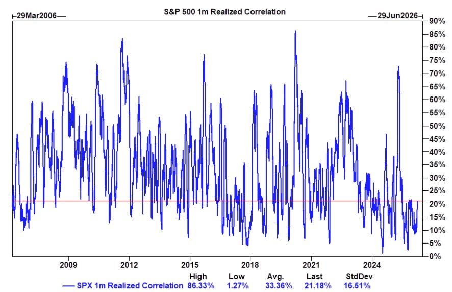What makes this interesting is the disconnect in the options market. S&P 1-month implied correlation has moved into the 40s, roughly twice realized levels. That gap historically resolves one of two ways: realized volatility catches up, or implied volatility compresses and hedges bleed out.