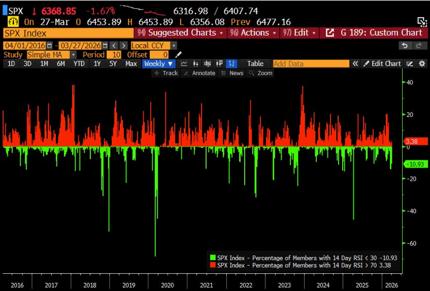 S&P 1-month realized correlation sits at roughly 20%, well below historical stress levels. This points to a narrow leadership unwind rather than broad-market liquidation. Breadth confirms the same picture. Only around 11% of S&P constituents are oversold, far short of levels typically associated with durable market bottoms.