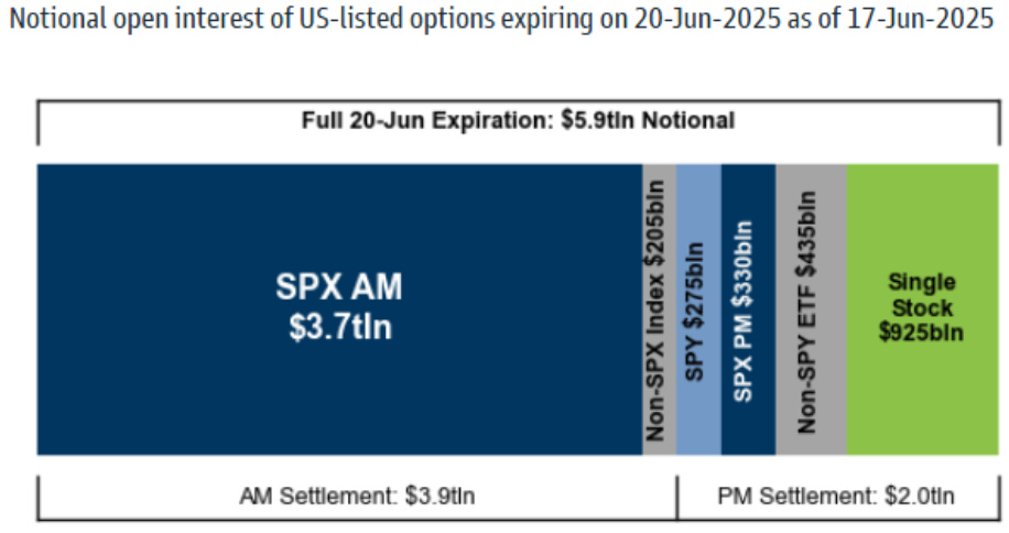 We see estimates that over $5.9 trillion of notional options exposure will expire today, including $4.0 trillion of SPX options and $925 billion notional of single stock options.