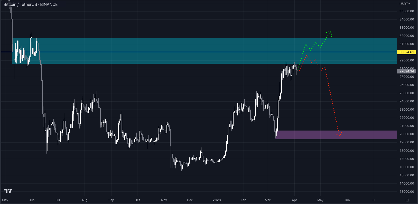 If we get a hard rejection at $30,000, a sharp move back down is what we’re eyeing up. Which is that purple demand zone we’ve mapped out.