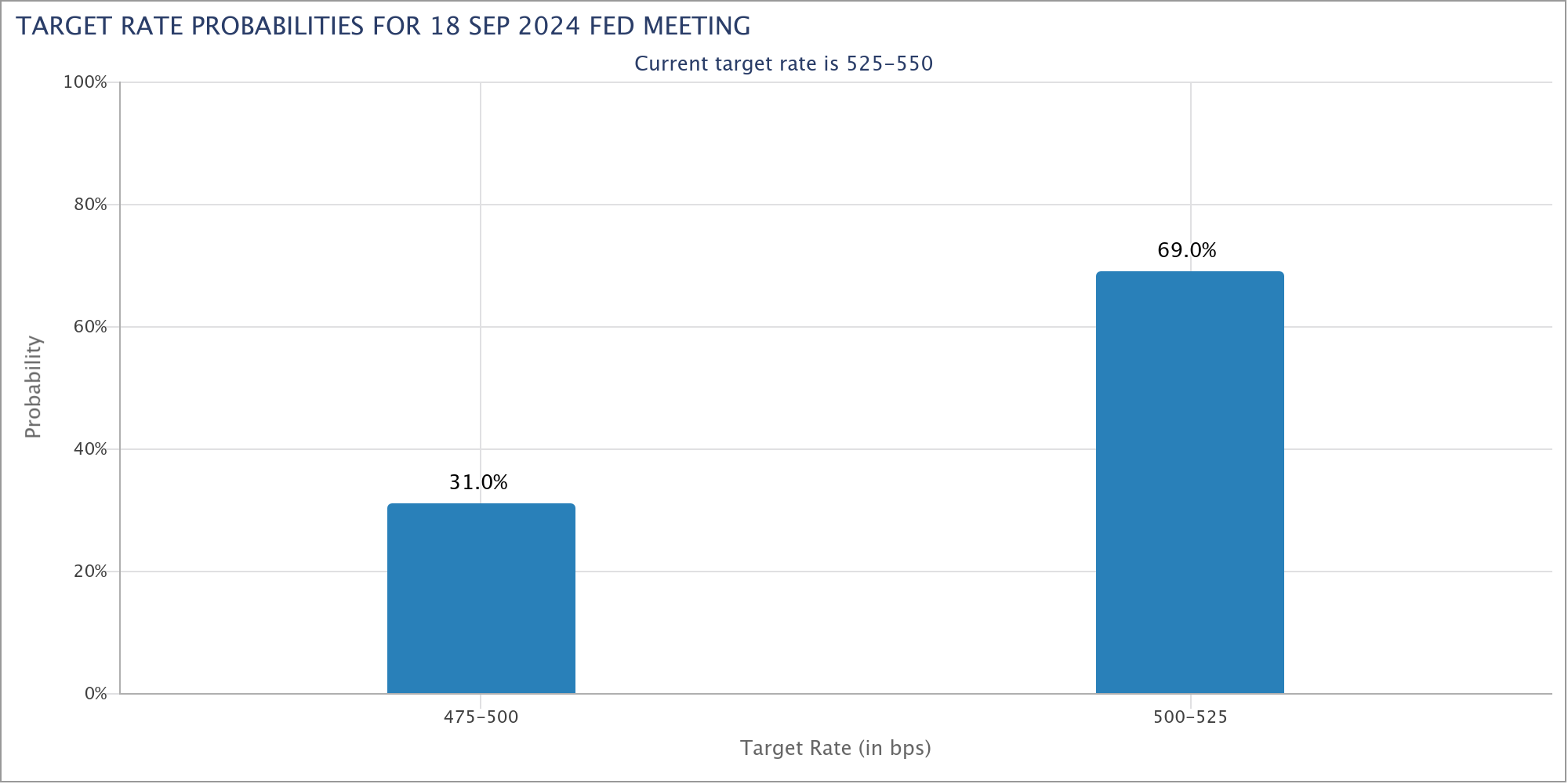 Financial markets are pricing in a 69% probability that the central bank will lower its Fed funds target rate by 25 basis points at the end of its monetary policy meeting next week, while assigning a 31% chance to a larger 50 basis point rate cut.