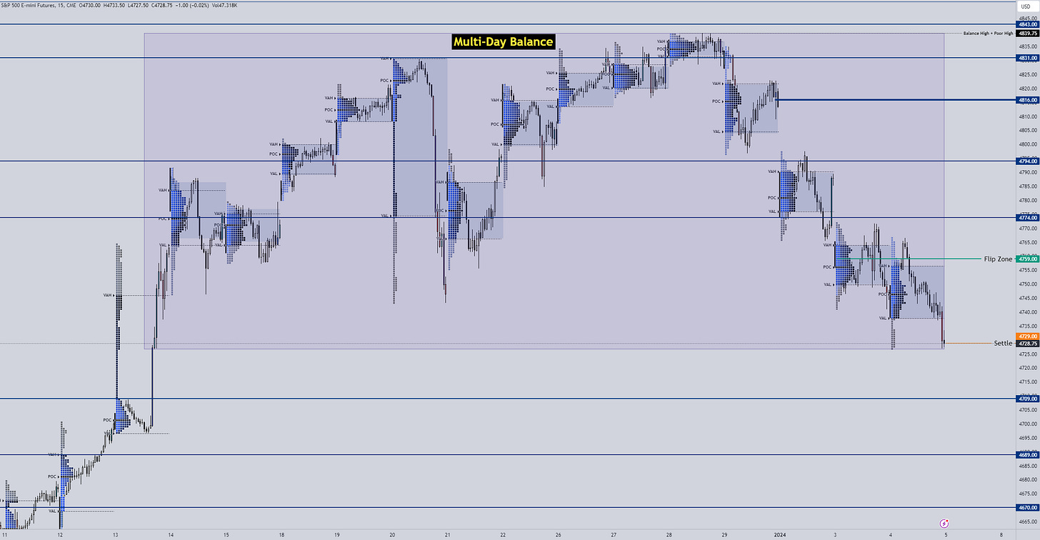 Market rejected off of the the pivot of 4761 after failure to maintain activity above and saw a more serious downside continuation with the market eventually closing bellow the key balance area.